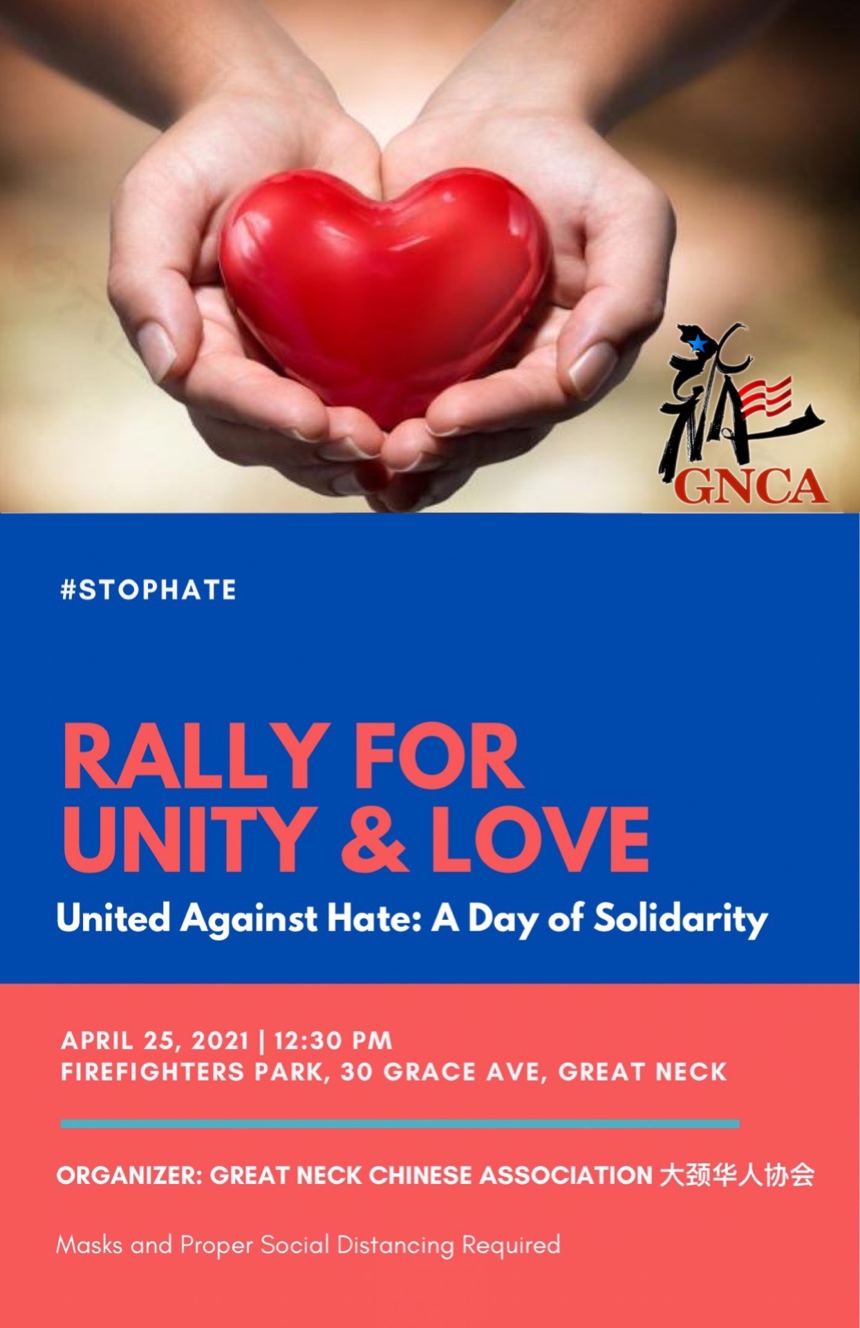 大颈华人协会将于 4月25日周日12:30PM为团结和友爱而举办一场集会。当下所有人都需要这样一场集会,让我们团结起来反对仇恨,为种族平等和正义共同发声、行动和努力。