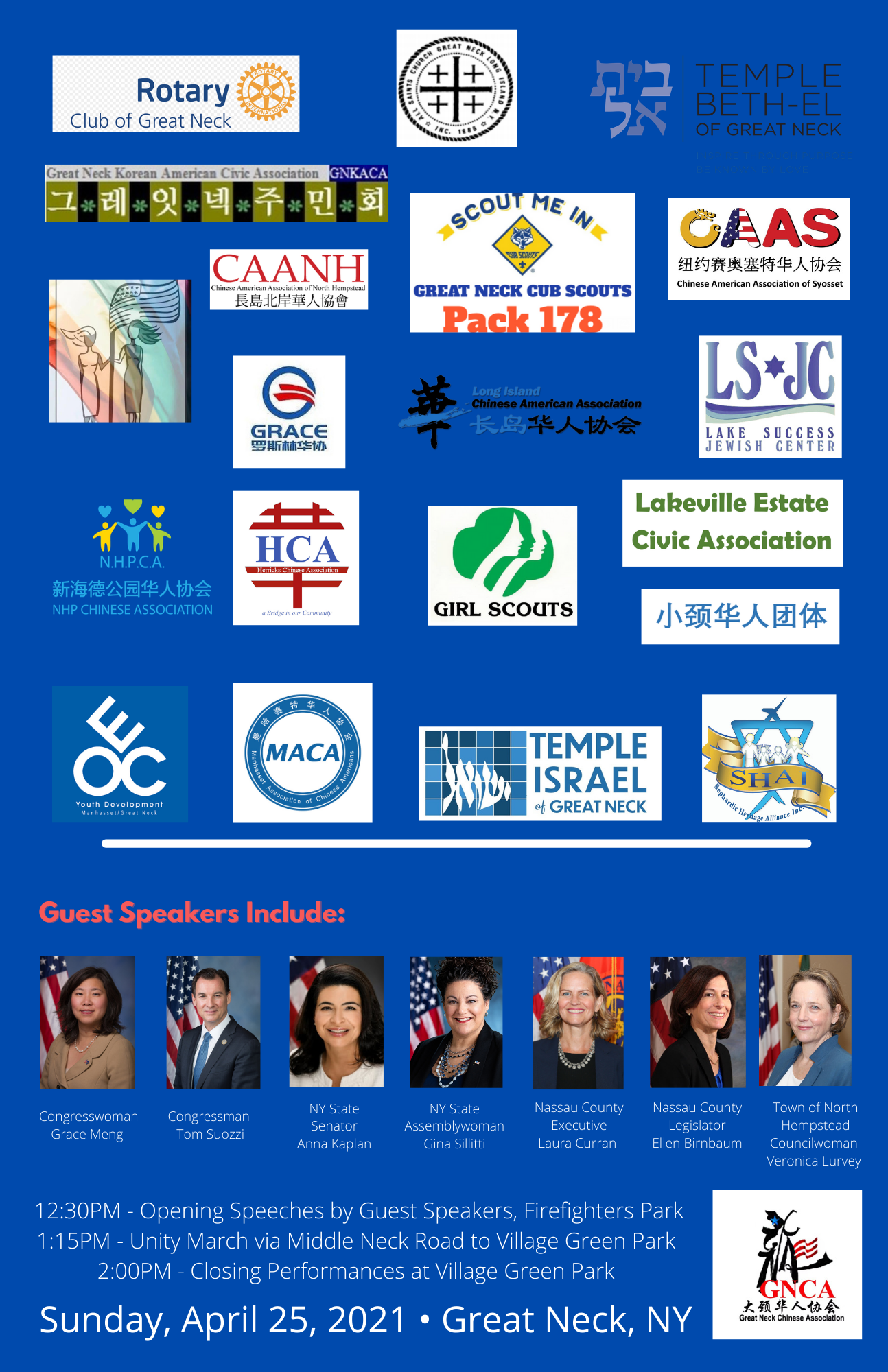 集会地点在长岛大颈镇Firefighters Park, 30 Grace Ave, Great Neck。介时会有众多组织前来支持,包括长岛华人协会,长岛北岸华人协会,曼哈赛特华人组织,纽约曼哈赛特华人协会,韩裔公民协会,小颈华人团体,新海德华人协会,大颈犹太教会Temple Beth-El of Great Neck,大颈犹太教会Temple Israel of Great Neck,女童子军组织,大颈幼童军组织等等,还有几位特邀发言人,包括联邦众议员Grace Meng和Tom Suozzi, 纽约州参议员Anna Kaplan, 纽约州众议员Gina Sillitti, 长岛纳苏郡议员Ellen Birnbaum, 北亨普斯特德镇议员Veronica Lurvey。