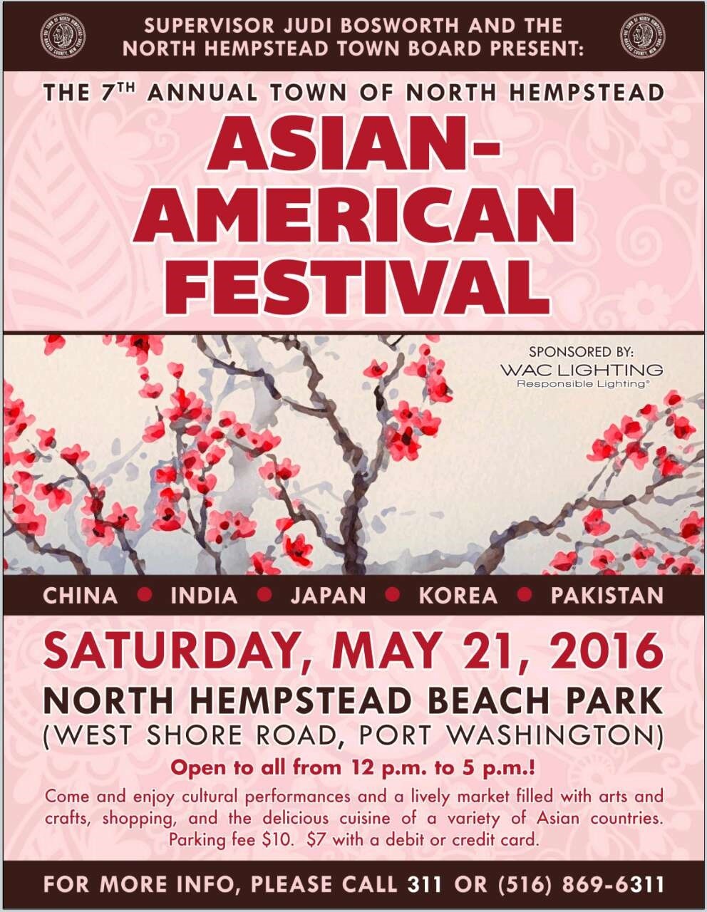 第7届 Asian-American Festival 将于5月21日在 North Hempstead Beach Park 举行。本次活动的内容包括来自中国,印度,日本,韩国及巴基斯坦5个国家的精彩表演,特色小吃,趣味手工和文化展览。每年都有将近上万名来自皇后区和纳苏郡的游客参加这个活动。阳光明媚的春天正是全家出行的好时机。希望各位千万不要错过这么好的活动。